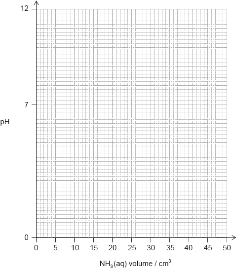 (i) Sketch the pH titration curve obtained when \({\text{50.0 c}}{{\text{m}}^{\text{3}}}\) of \({\text{0.100 mol}}\,{\text{d}}{{\text{m}}^{ - 3}}{\text{N}}{{\text{H}}_{\text{3}}}{\text{(aq)}}\) is added to \({\text{25.0 c}}{{\text{m}}^{\text{3}}}\) of \({\text{0.100 mol}}\,{\text{d}}{{\text{m}}^{ - 3}}{\text{HCl (aq)}}\).