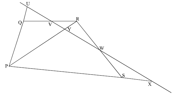 A straight line meets the sides (PQ), (QR), (RS), (SP) of a quadrilateral PQRS at the points U, V, W, X respectively. Use Menelaus’ theorem to show that\[\frac{{{\rm{PU}}}}{{{\rm{UQ}}}} \times \frac{{{\rm{QV}}}}{{{\rm{VR}}}} \times \frac{{{\rm{RW}}}}{{{\rm{WS}}}} \times \frac{{{\rm{SX}}}}{{{\rm{XP}}}} = 1.\]