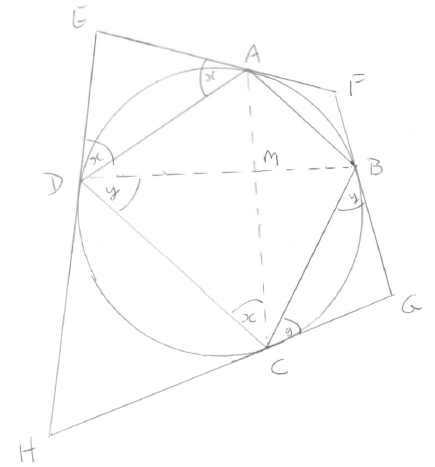 diagram showing tangents EAF, FBG, GCH and HDE; diagonals cross at M. M1