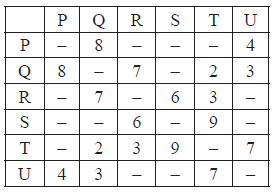 The cost adjacency matrix of a graph with vertices P, Q, R, S, T, U is given by