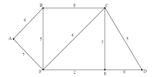 Use Dijkstra’s algorithm to find the path of minimum total weight joining A to D, and state its weight. Your solution should indicate clearly the use of this algorithm.