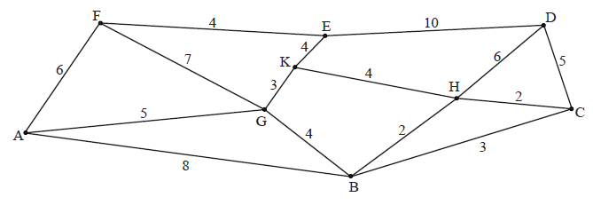 Use Dijkstra’s algorithm to find the path of minimum total weight joining A to D, stating this total weight. Your solution should show clearly that this algorithm has been used.
