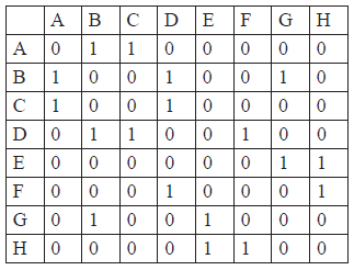 The graph \(P\) has the following adjacency table, defined for vertices A to H, where each element represents the number of edges between the respective vertices.