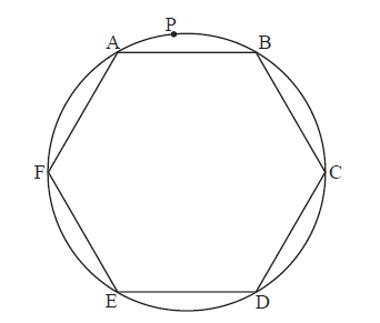 The diagram shows a hexagon ABCDEF inscribed in a circle. All the sides of the hexagon are equal in length. The point P lies on the minor arc AB of the circle. Using Ptolemy’s theorem, show that\[{\rm{PE}} + {\rm{PD}} = {\rm{PA}} + {\rm{PB}} + {\rm{PC}} + {\rm{PF}}\]