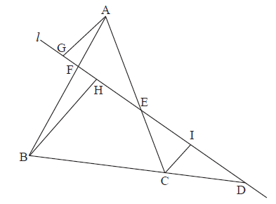 The diagram shows the line \(l\) meeting the sides of the triangle ABC at the points D, E and F. The perpendiculars to \(l\) from A, B and C meet \(l\) at G, H and I.