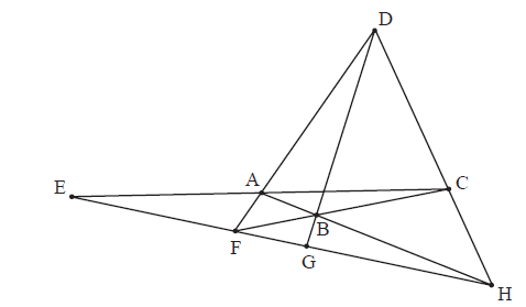 (b) The lines \({\text{(FD), (CA)}}\) meet at the point \({\text{H}}\) and the lines \({\text{(DE), (AB)}}\) meet at the point \({\text{I}}\). Show that the points \({\text{G, H, I}}\) are collinear.