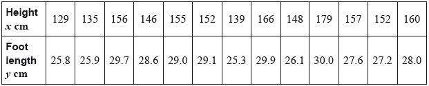 A sample of 13 boys is taken and the height and foot length of each boy are measured.