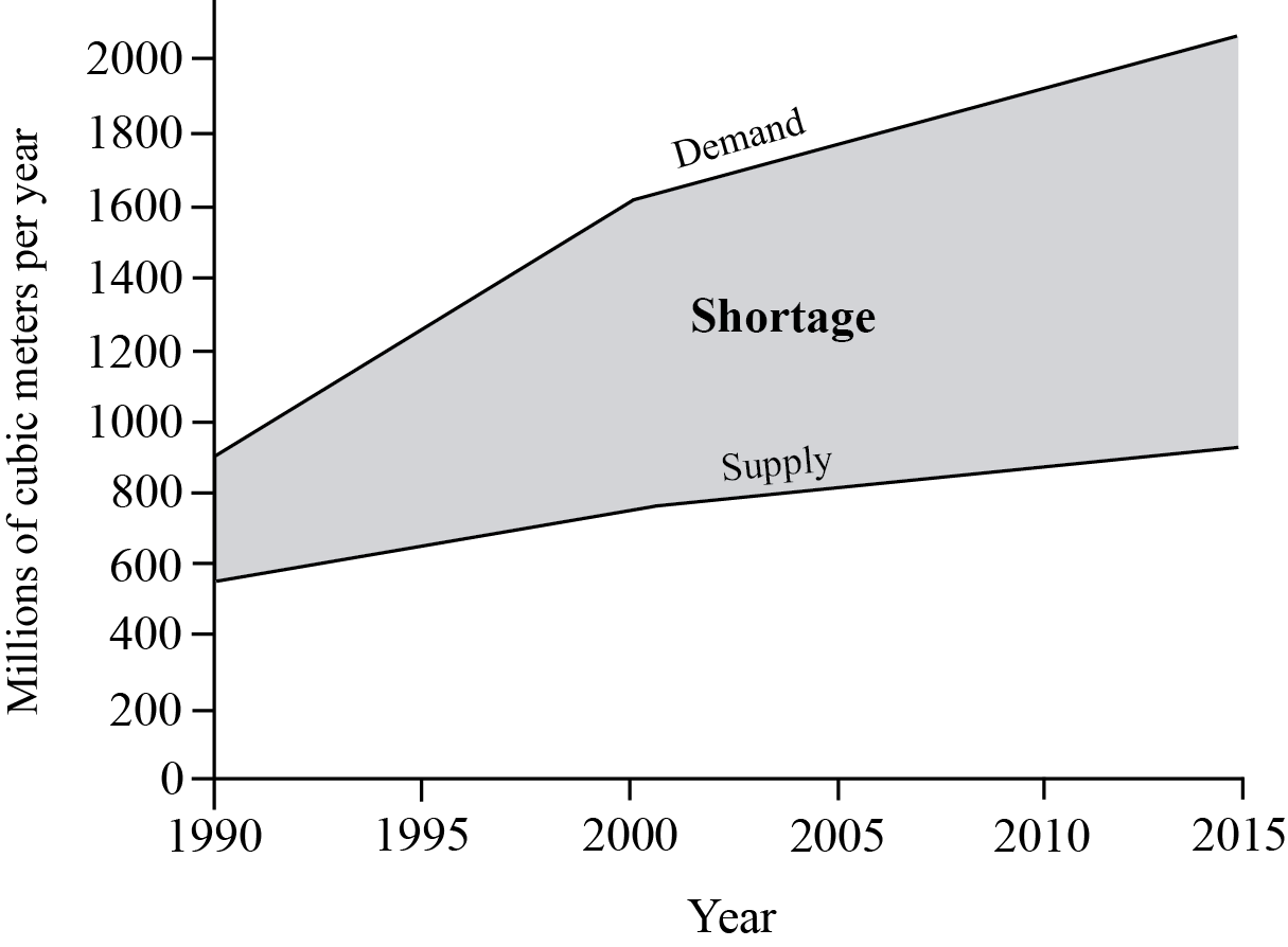 The graph shows the supply and demand for water in an unnamed country from 1990 to 2015.