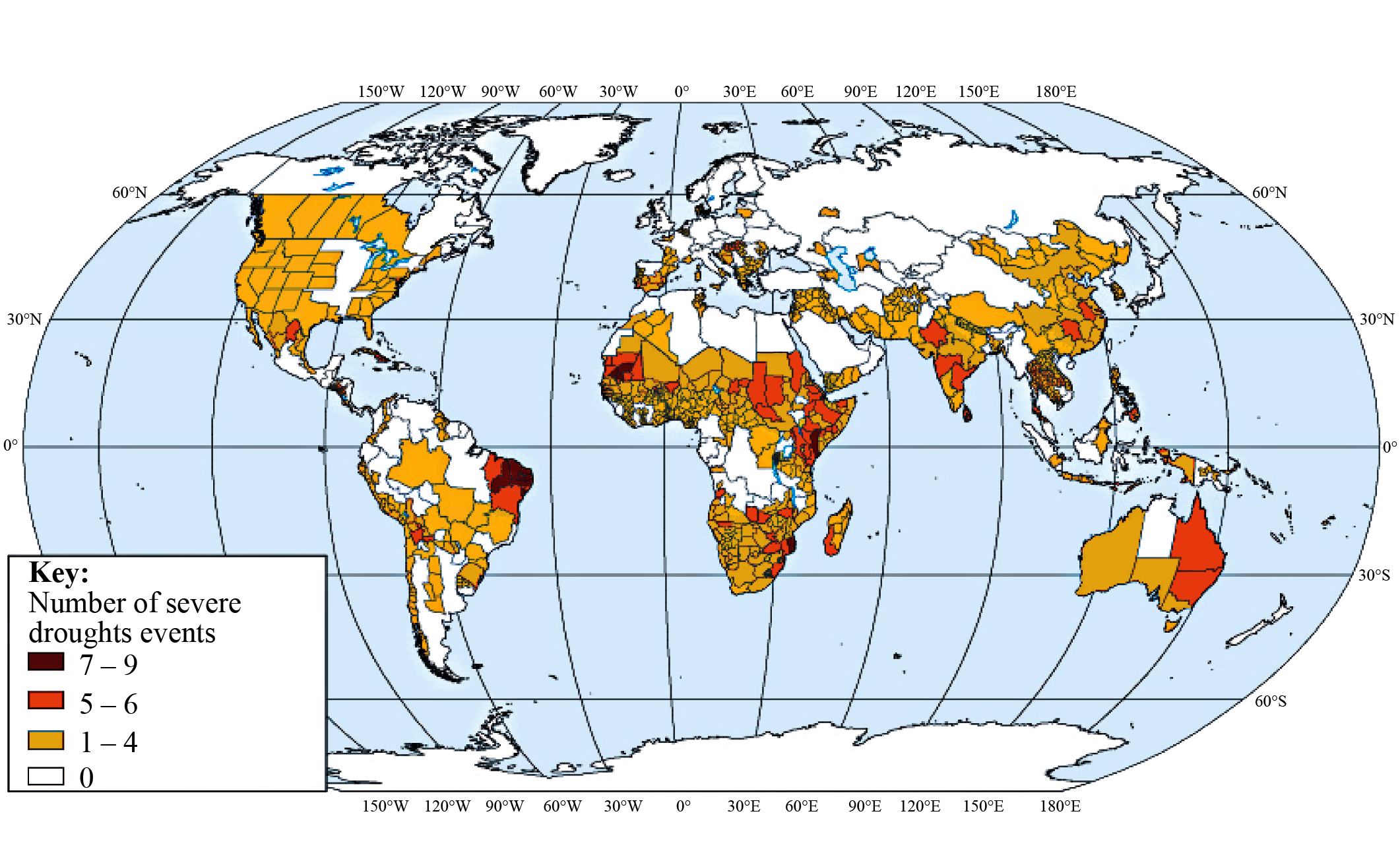 The map shows the world distribution of severe drought events from 1974 to 2004.