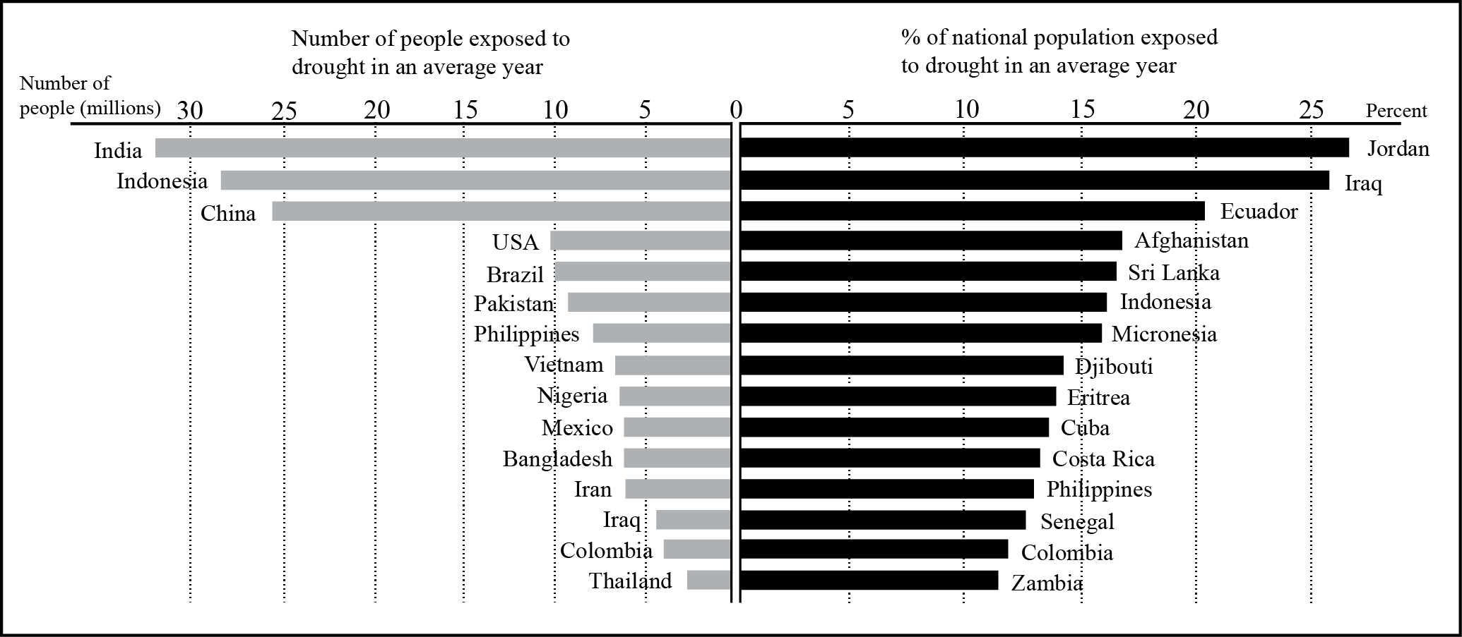 The graph shows the number of people, and the percentage of the total population, exposed to drought in different countries in an average year.
