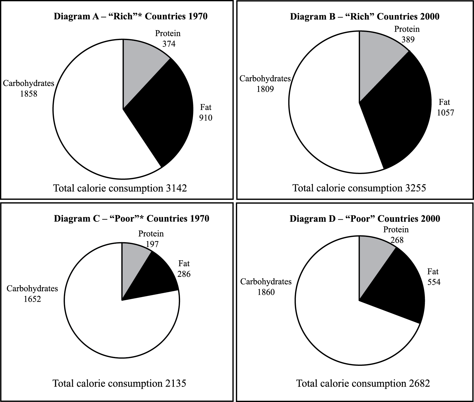 Total calorie consumption of rich countries is greater [1 mark] and carbohydrate consumption in poor countries is greater than in rich countries [1 mark]. Accept other valid changes.