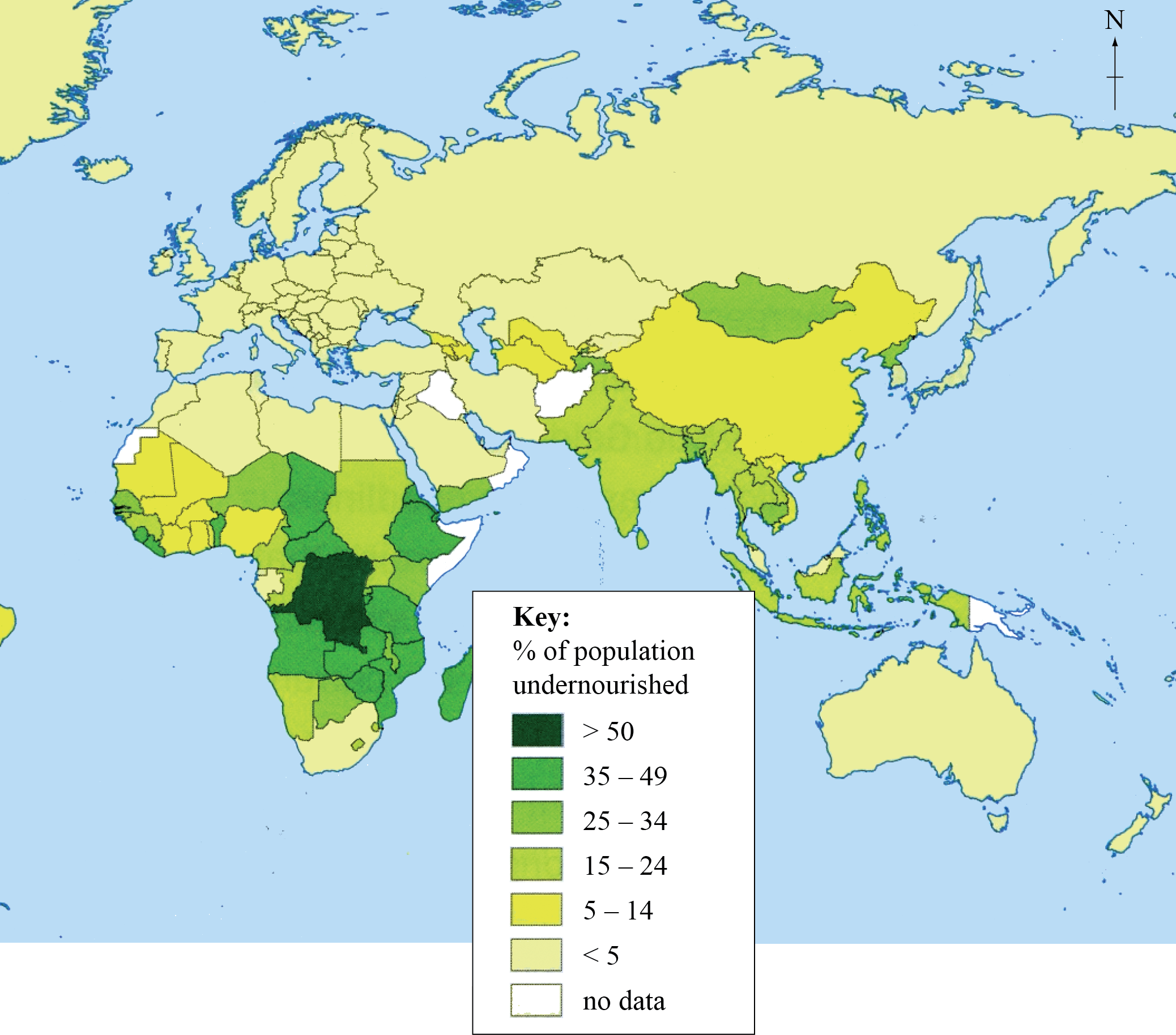 At band E there should be either more than two reasons examined/discussed, in more detail, with example(s) (eg rapid population growth in LEDCs and climate problems such as drought) or an examination that shows the reasons are complex/interrelated/do not apply to all parts of the population.