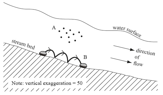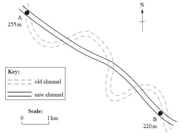- Award [1 mark] for establishing a link between discharge and channel shape (lower discharge in wide, shallow or deep, narrow channels, or equivalent point made).