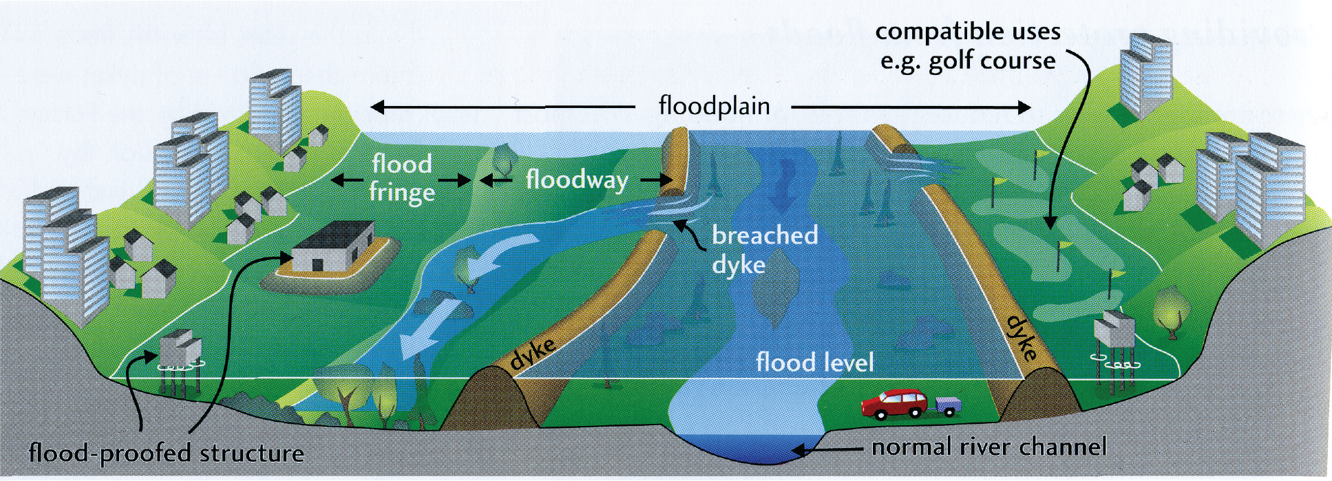 Drainage ditches/canals [1] carry water off the floodplain [1].