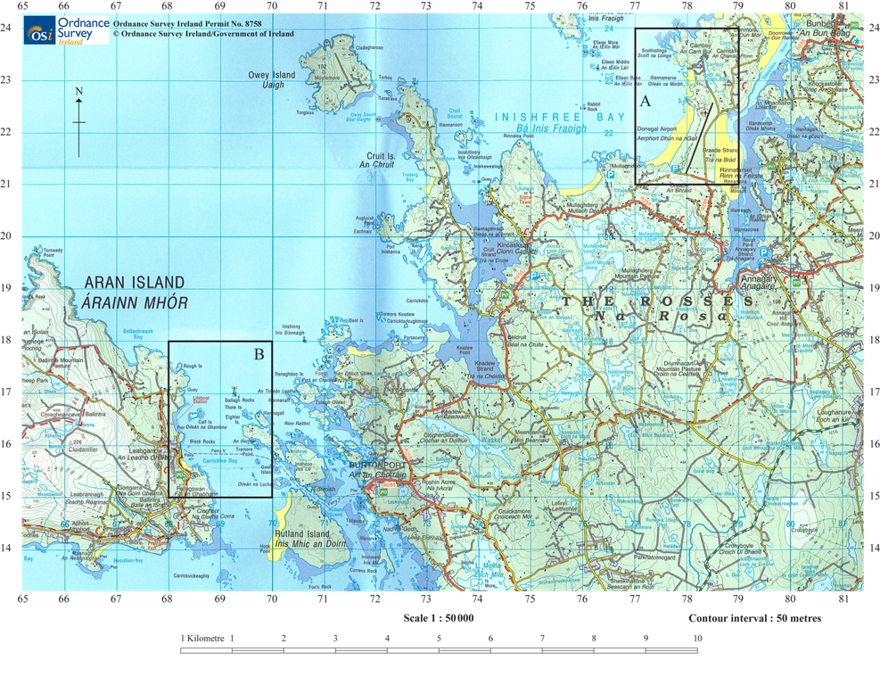 Map B shows the area around the city of Prince Rupert (population: 13 000) on the west coast of Canada. The scale of the map is 1:50 000. The contour interval is 40 metres.