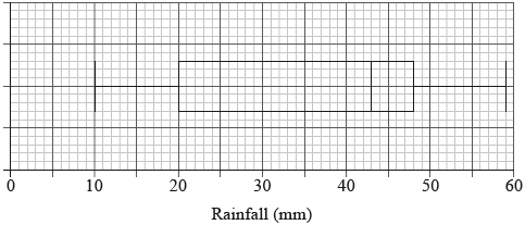 The distribution of rainfall in a town over 80 days is displayed on the following box-and-whisker diagram.