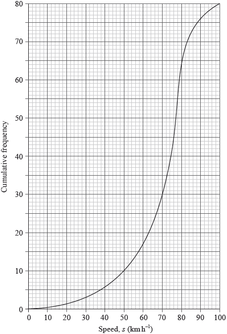 The cumulative frequency graph represents the speed, s, in \({\text{km }}{{\text{h}}^{ - 1}}\), of 80 cars passing a speed camera.