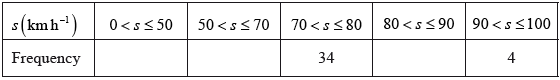 Complete the following grouped frequency table for \(s\), the speed of the cars passing the camera.