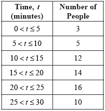 200 people were asked the amount of time T (minutes) they had spent in the supermarket. The results are represented in the table below.