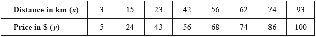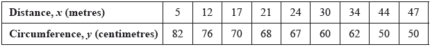 As part of his IB Biology field work, Barry was asked to measure the circumference of trees, in centimetres, that were growing at different distances, in metres, from a river bank. His results are summarized in the following table.