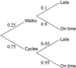 Maria travels to school either by walking or by bicycle. The probability she cycles to school is 0.75.