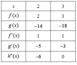 Consider the functions \(f(x)\) , \(g(x)\) and \(h(x)\) . The following table gives some values associated with these functions.
