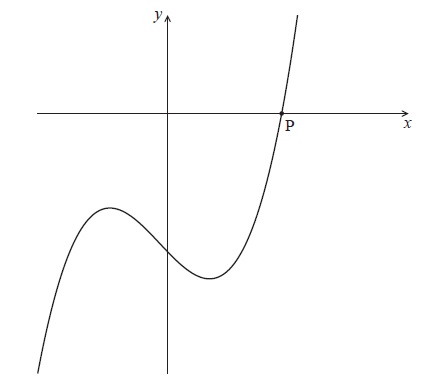 The graph has a local maximum at P(3, 5) , a local minimum at Q(7, − 5) , and crosses the x-axis at R.