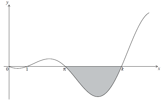 The shaded region \(B\) is enclosed by the curve, the \(x\)-axis and the line \(x = 5\), and has area \({\text{0.21 unit}}{{\text{s}}^{\text{2}}}\).