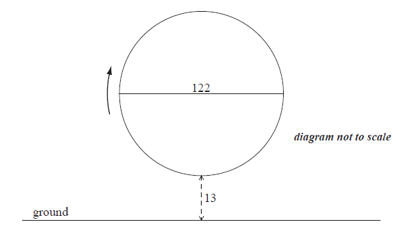 A Ferris wheel with diameter \(122\) metres rotates clockwise at a constant speed. The wheel completes \(2.4\) rotations every hour. The bottom of the wheel is \(13\) metres above the ground.