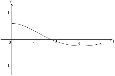 A particle P moves along a straight line so that its velocity, \(v\,{\text{m}}{{\text{s}}^{ - 1}}\), after \(t\) seconds, is given by \(v = \cos 3t - 2\sin t - 0.5\), for \(0 \leqslant t \leqslant 5\). The initial displacement of P from a fixed point O is 4 metres.