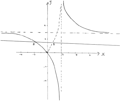 vertical asymptote at \(x = 2\) A1
