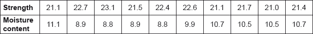 The strength of beams compared against the moisture content of the beam is indicated in the following table. You should assume that strength and moisture content are each normally distributed.