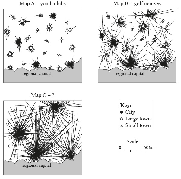 The three maps show the catchment areas (illustrated by visitor “trip lines”) for three different sport and recreational facilities located in the settlements of a region.