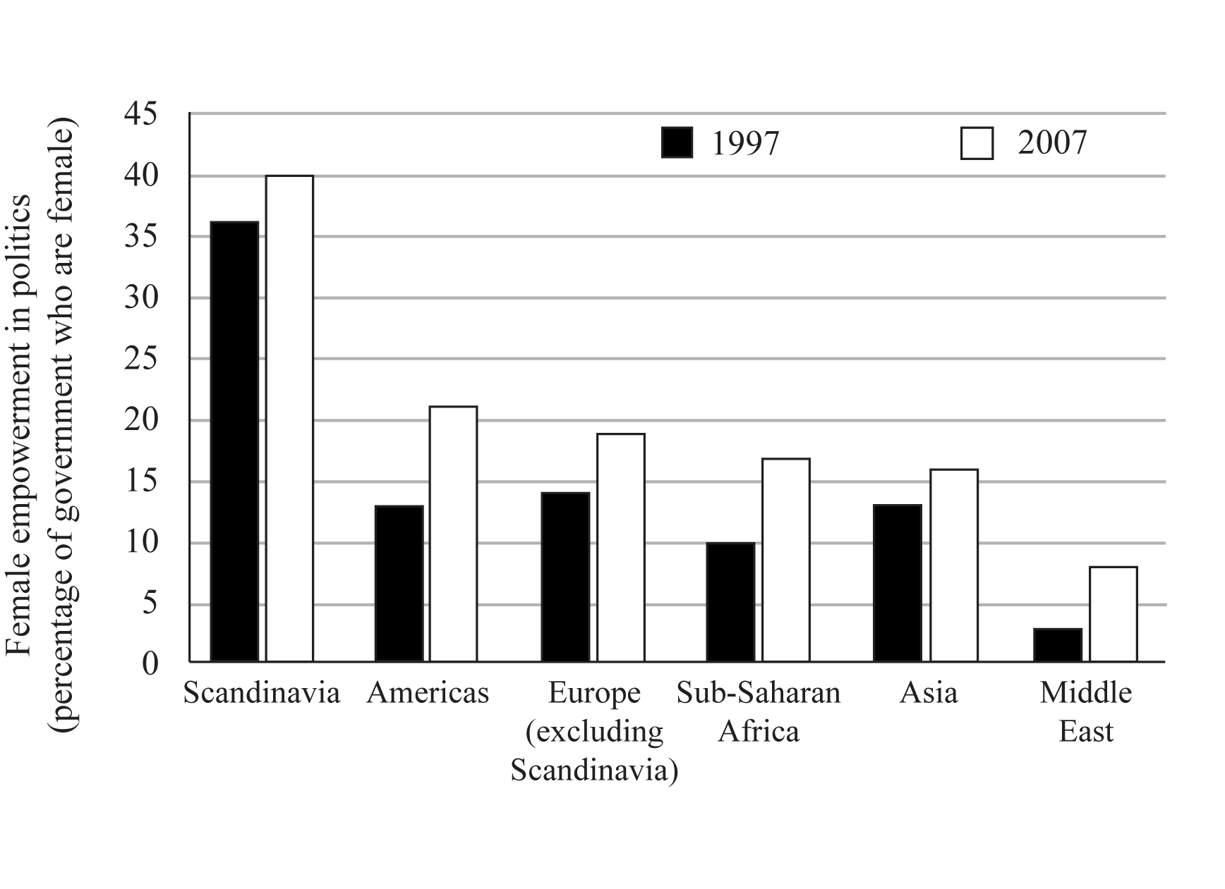 Scandinavia as a region has the greatest with approximately 36% involved in government [1 mark]; the Middle East has the lowest involvement of women in government with approximately 3% [1 mark]; the rest of the world averages between 10% and 14% [1 mark]. No quantification or only a list with values should be awarded 2 marks maximum.