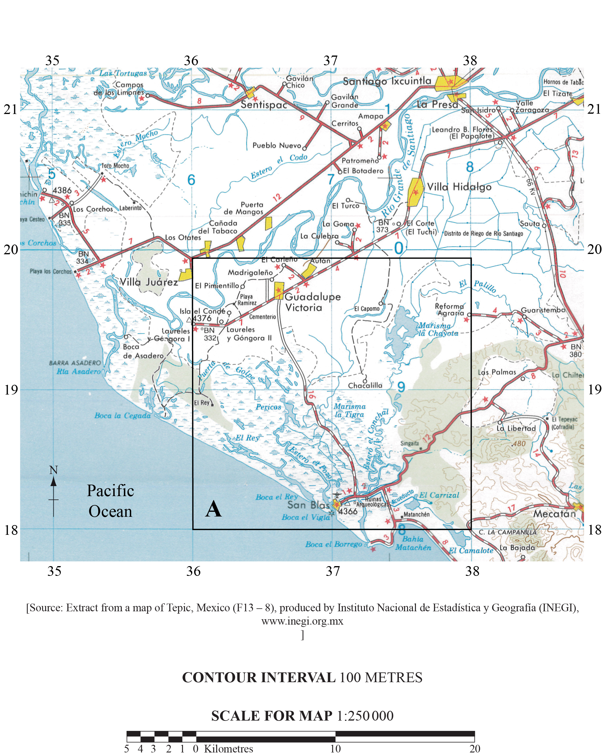The map extract shows an area in western Mexico. The scale of the map is 1:250 000 and the contour interval is 100 metres.