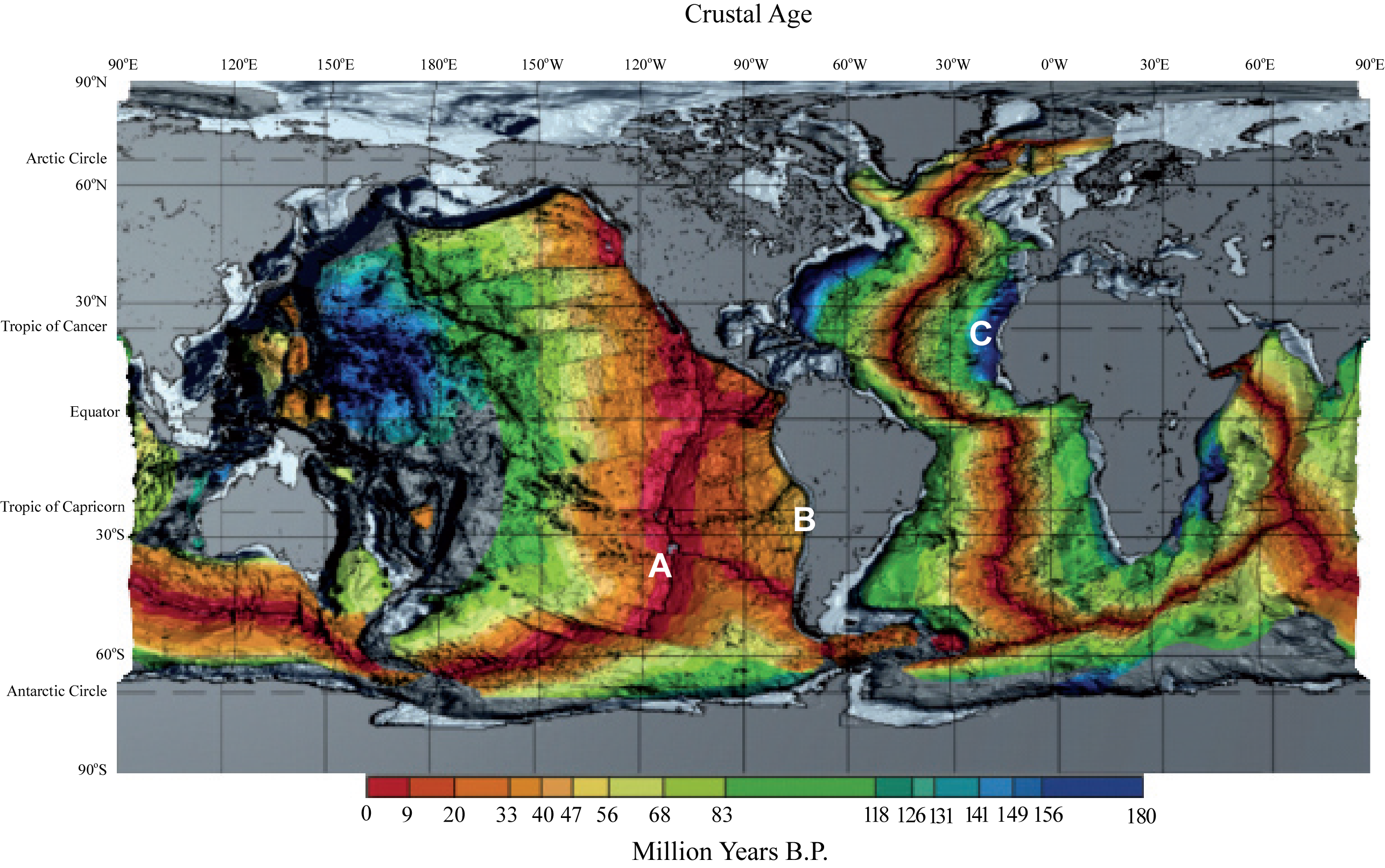 The age of the crust at C is between 141.9 and 156.8 [1 mark] million years BP [1 mark]. Any number within the range is acceptable; only answers within this range can gain the second mark.
