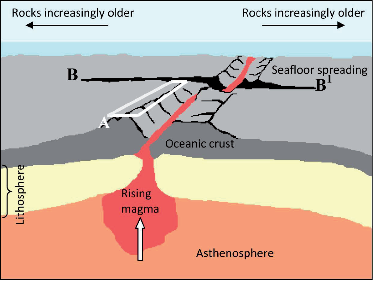 As a result of sea floor spreading and the creation of newly “constructed” ocean floor at the constructive boundary [1 mark], the age of the floor increases with distance and the oldest floor is found, therefore, furthest away from the ridge and rift systems [1 mark].