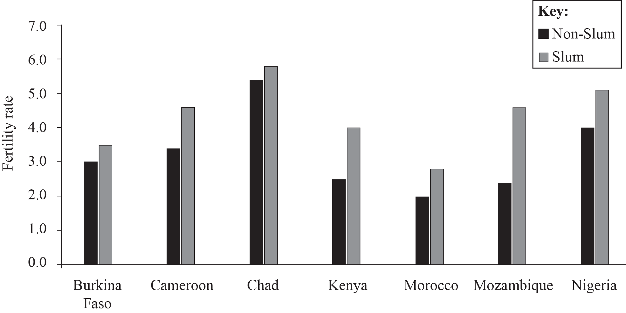 The graph shows fertility rates in 2006 for slum and non-slum areas in various African countries. Fertility is an indicator of poverty.