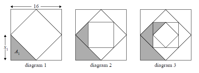 The sides of a square are 16 cm in length. The midpoints of the sides of this square are joined to form a new square and four triangles (diagram 1). The process is repeated twice, as shown in diagrams 2 and 3.