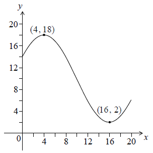 The graph has a maximum at \((4, 18)\) and a minimum at \((16, 2)\).