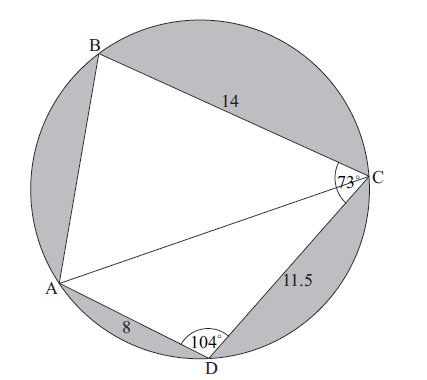 BC = \(14\) m, CD = \(11.5\) m, AD = \(8\) m, \(A\hat DC = {104^ \circ }\) , and \(B\hat CD = {73^ \circ }\) .