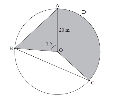The circle has centre O and a radius of 20 m, and the points A, B, C and D lie on the circle. Angle AOB is 1.5 radians.
