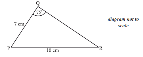 The diagram below shows triangle PQR. The length of [PQ] is 7 cm , the length of [PR] is 10 cm , and \({\rm{P}}\widehat {\rm{Q}}{\rm{R}}\) is \(75^\circ \) .