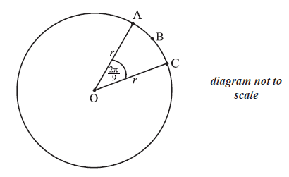 The diagram below shows a circle centre O, with radius r. The length of arc ABC is \(3\pi {\text{ cm}}\) and \({\rm{A}}\widehat {\rm{O}}{\rm{C}} = \frac{{2\pi }}{9}\).
