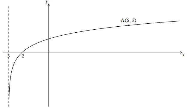The graph passes through A(6, 2) , has an x-intercept at (−2, 0) and has an asymptote at \(x = - 3\) .