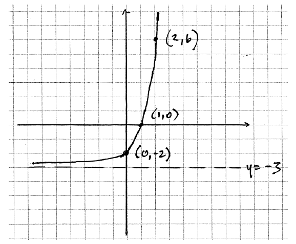 Note: Award A1 for asymptote at \(y = - 3\) , A1 for an increasing function that is concave up, A1 for a positive x-intercept and a negative y-intercept, A1 for passing through the point \((2{\text{, }}6)\) .
