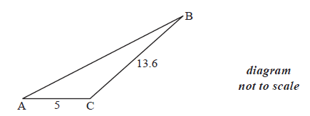 The angle at C is obtuse, \({\text{AC}} = 5{\text{ cm}}\), \({\text{BC}} =13.6{\text{ cm}}\) and the area is \(20{\text{ c}}{\text{m}}^2\) .