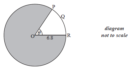 e.g. \(\pi {(6.8)^2} - \frac{1}{2}(1.25)({6.8^2})\) ; \(145.267 \ldots - 28.9\) ; \(\pi {r^2} - \frac{1}{2}{r^2}\sin \theta \)