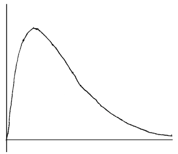 Note: Award A1 for approximately correct shape with inflexion/change of curvature, A1 for maximum skewed to the left, A1 for asymptotic behaviour to the right.