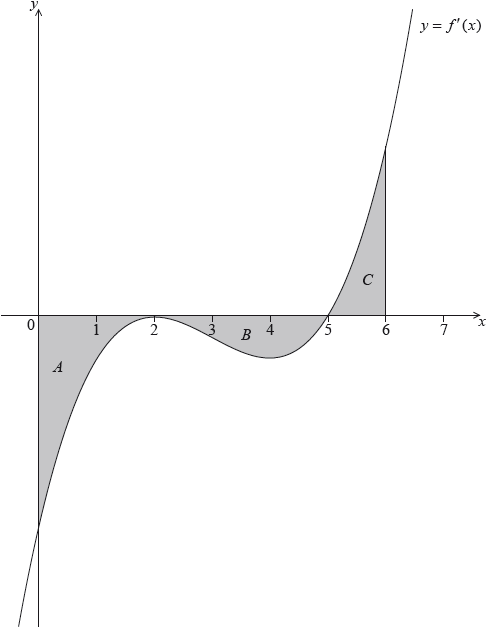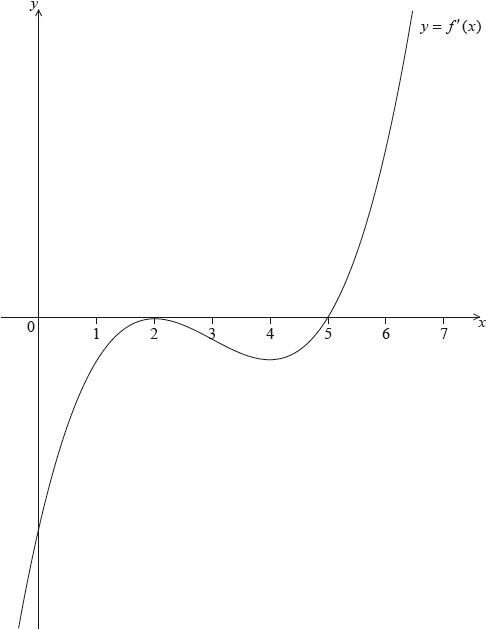 Let \(y = f(x)\), for \( - 0.5 \le \) x \( \le \) \(6.5\). The following diagram shows the graph of \(f'\), the derivative of \(f\).